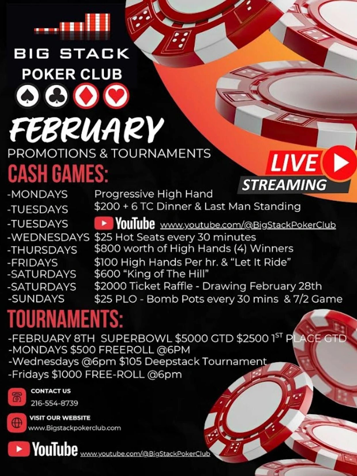 Big Stack Social is a member only club catering to poker players and the poker community. Big Stack offers poker tournaments & ring games, rake free! This Includes but is not limited to, No-limit Texas Hold'em, Limit Texas Hold'em, Pot Limit Omaha, Gin & other games upon request.